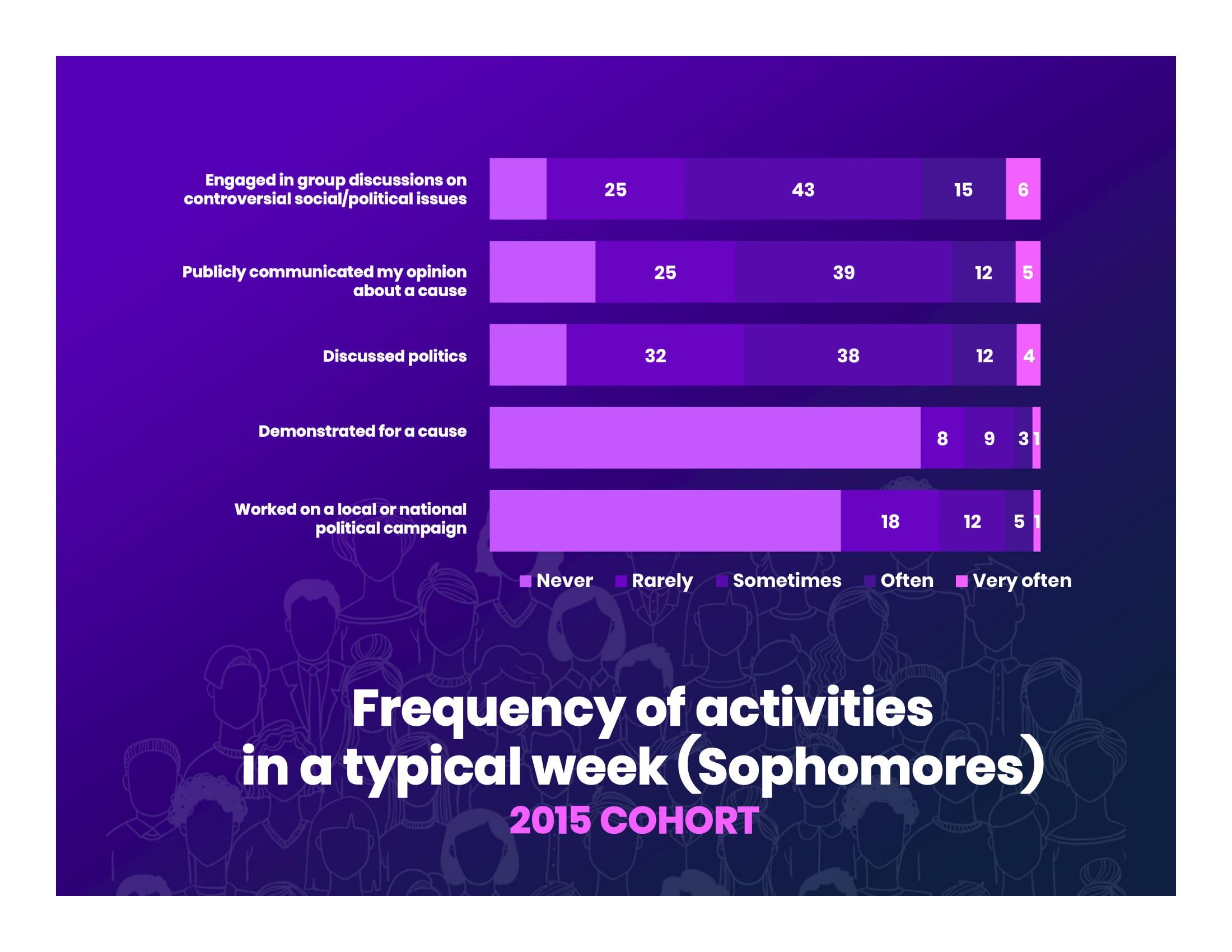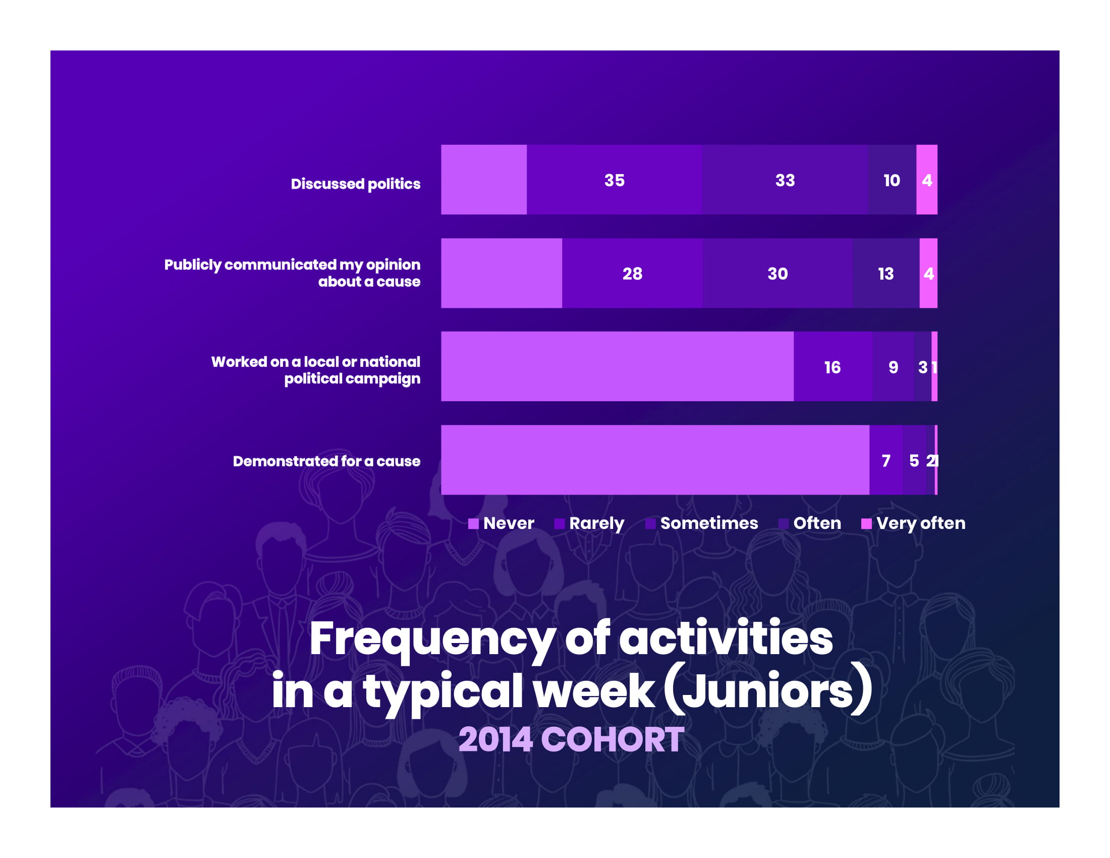 Also, in 2014 cohort, a large percentage of Gen Zs never demonstrated for a cause and haven’t worked on a local or national political campaign with 86% and 71% respectively. While 24% never communicated their political comments and 17% never discussed politics.
