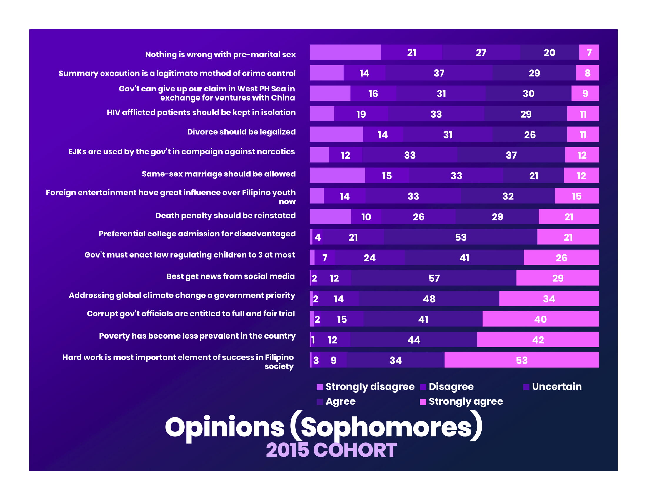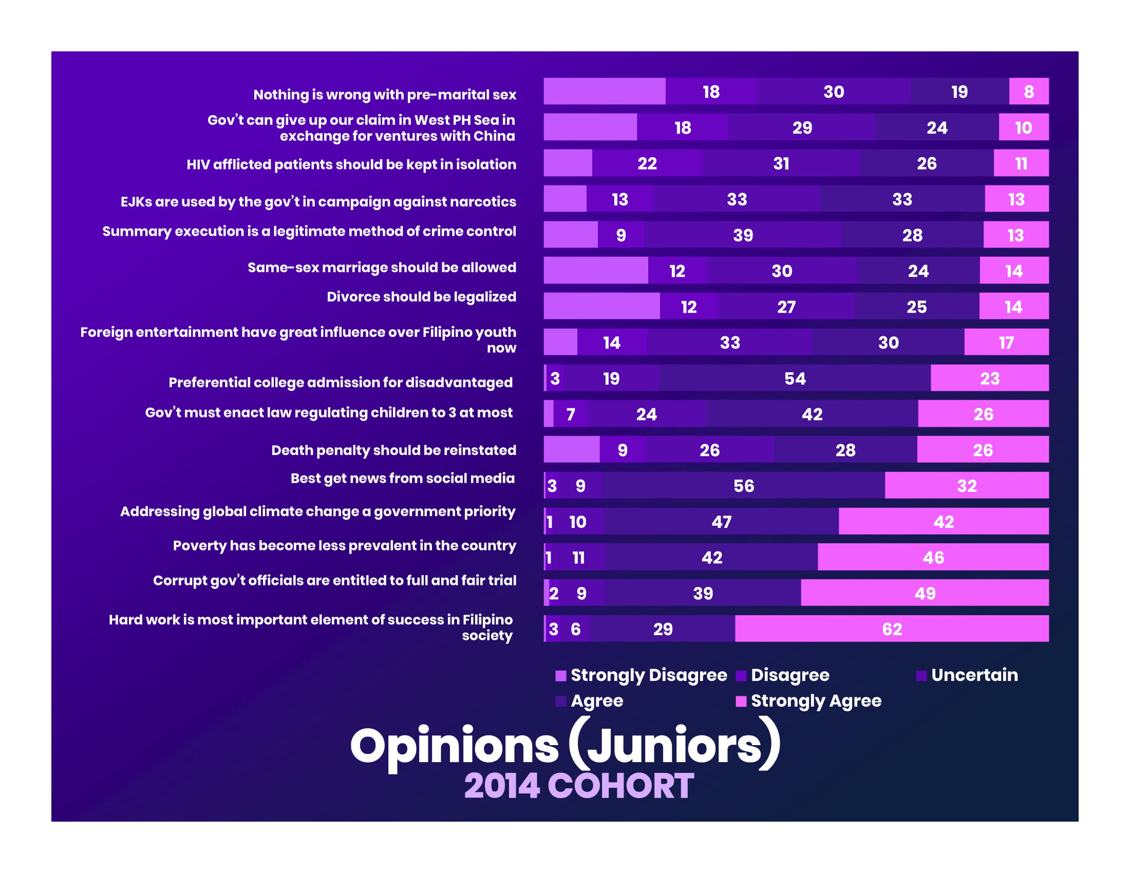In the data, the students are apathetic when it comes to explaining their opinions about social and political issues. They even have surprising stands on the country’s most pressing issues.