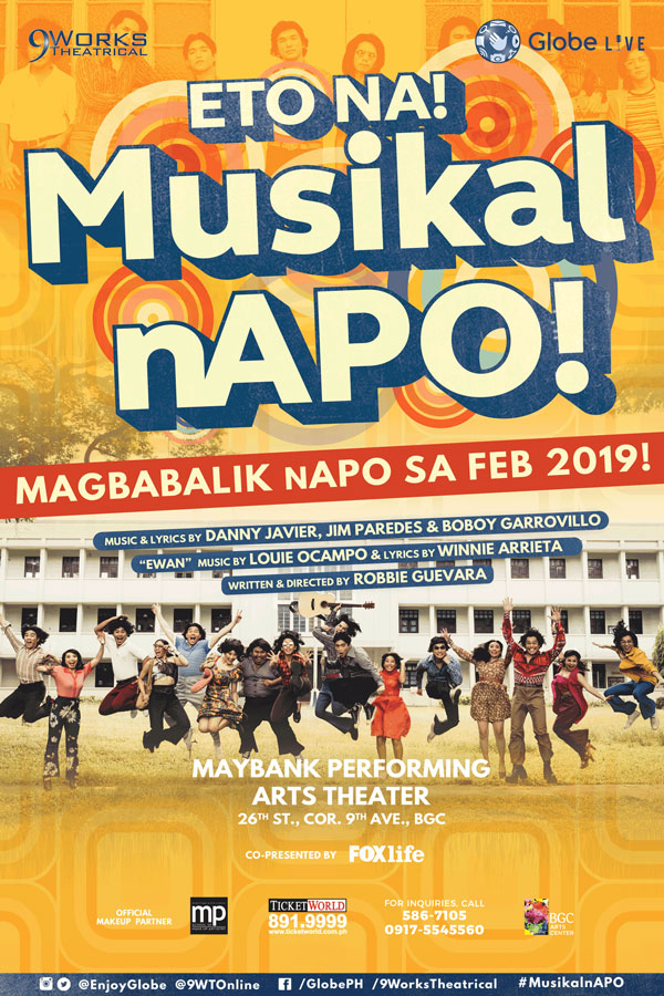 “Eto Na! Musikal nAPO!” is an all-original Filipino musical which tells the story of Jaime, Donnie, and Bobbie as they try to win a singing competition and survive their college life, adulthood, and the dark years of the Martial Law era. The characters were loosely based on the lives of Apo’s members, Jim Paredes, Danny Javier, and Boboy Garovillo. As the title implies, the story is told through the songs penned by the iconic trio.