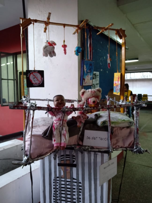 At the back is an installation named “Rock-a-bye, Child” which utilized old dolls and toys to symbolize the effect of poverty among the Filipino children in the slums. In this artwork, a crib was made to look like a cage through its bars and a bloodied doll and stuffed toy were placed inside.
