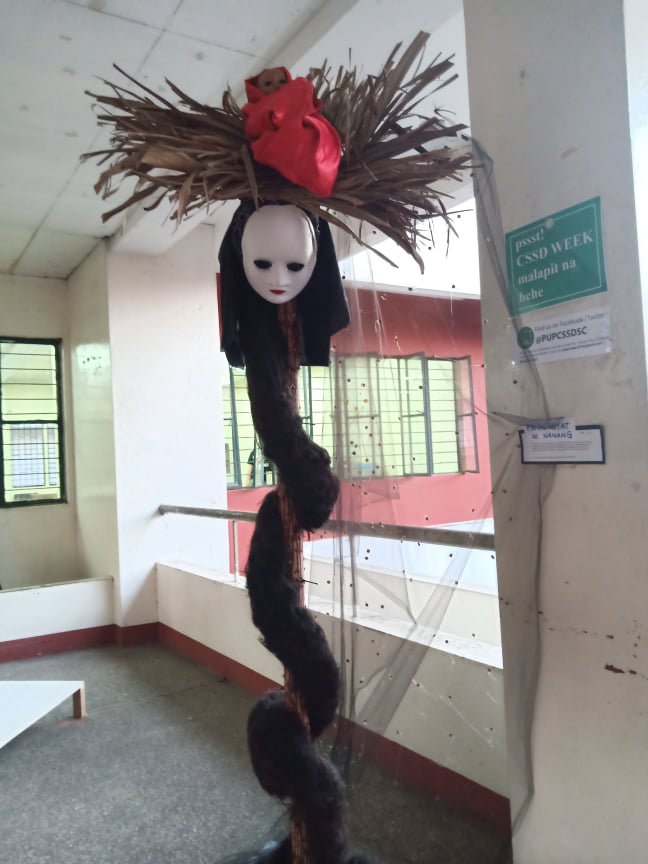 Another artwork is the “Panag-ayat ni Nanang,” created by STEM 12-02, which is the Ilocano translation of a mother’s love—it tells the story of a single mother suffering poverty while raising her children. The installation made use of a mask to represent the mother and above its head is an infant doll wrapped in red cloth which looks like a human heart.