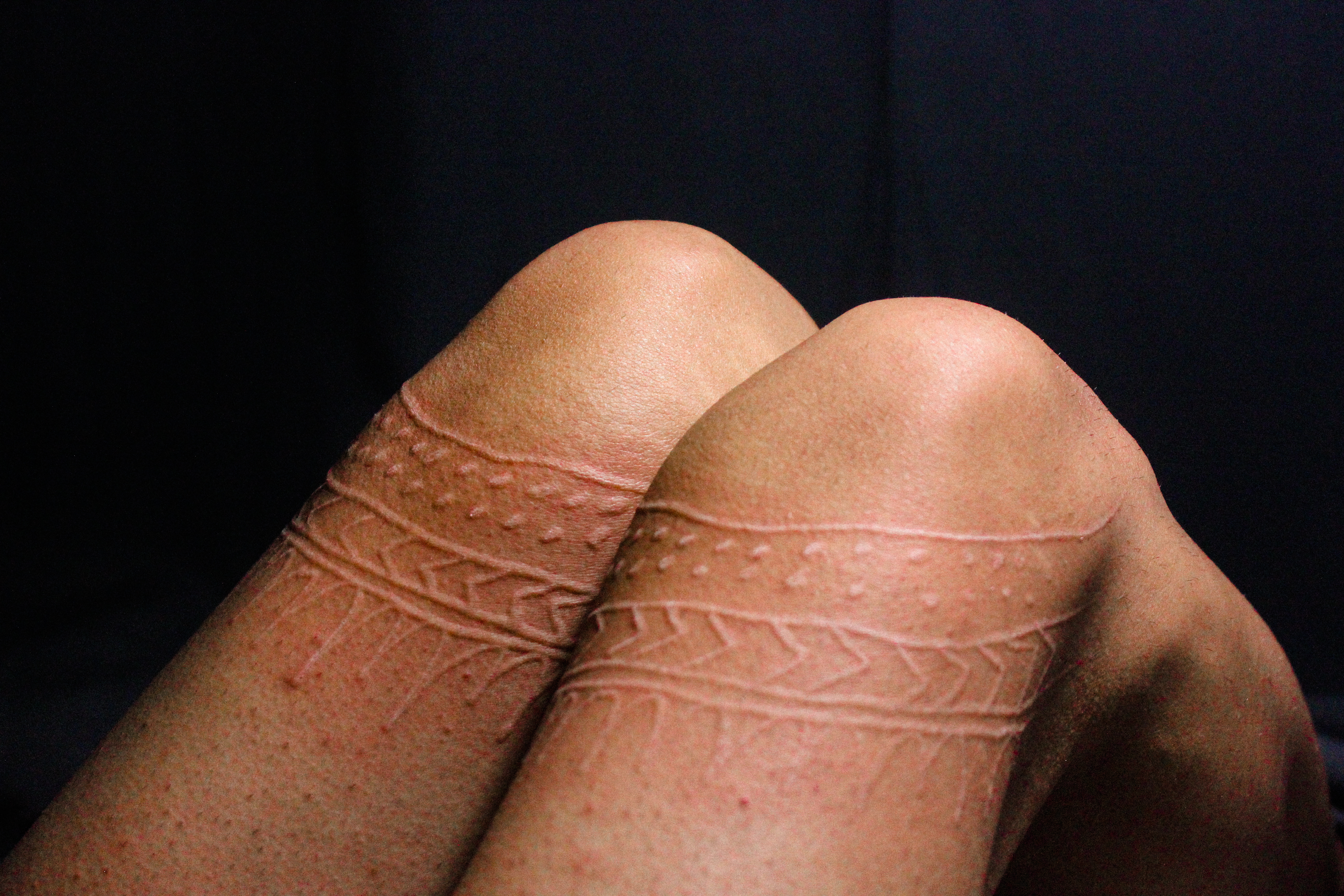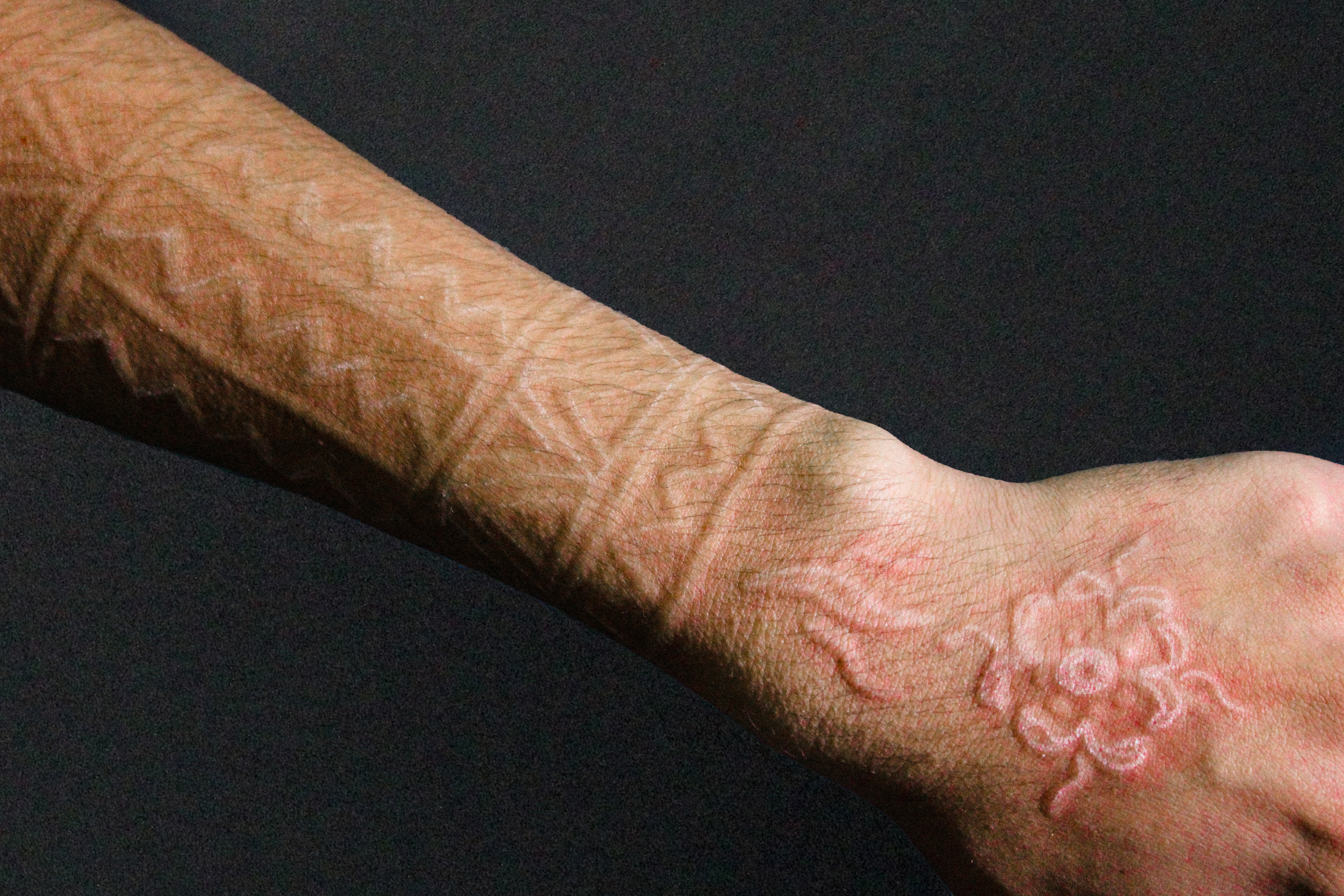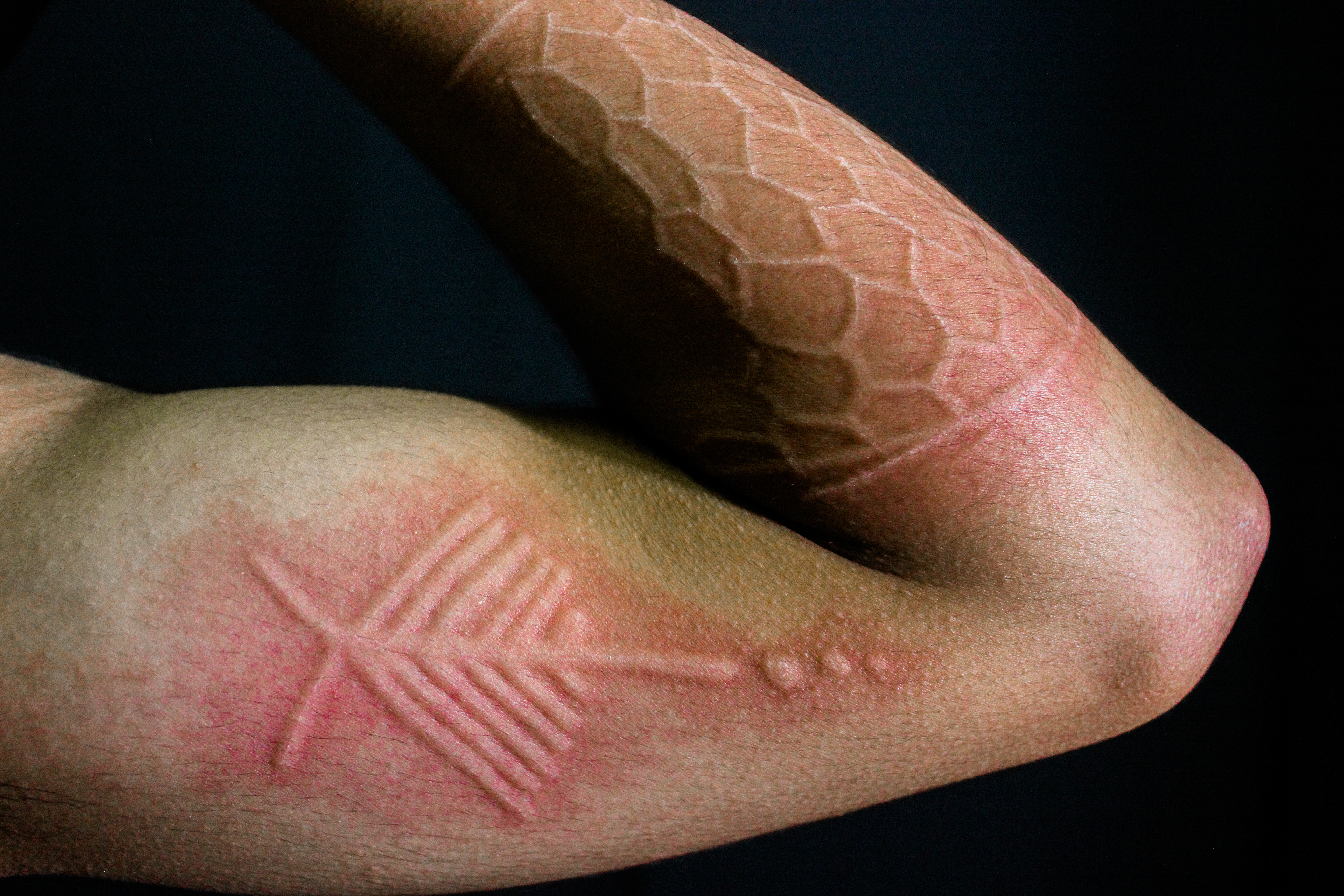 Lara has a skin condition called Dermatographic Urticaria which means he can cause wheals on his own skin usually a red itchy bump that according to him lasts for 30 minutes long.