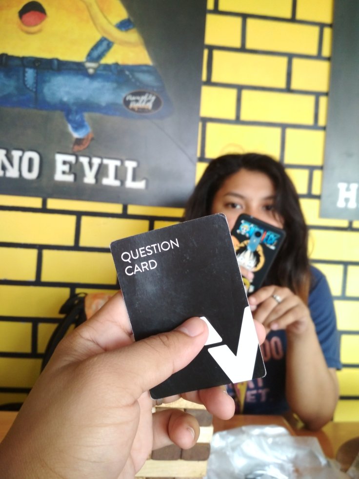 You won’t get bored on this place because on the table you will see a Jengga and Question cards. You can play with your company while eating or while waiting for your order. And before I forget to remind you, the liquid in a bottle of wine is water not an alcohol. No seriously it’s water.