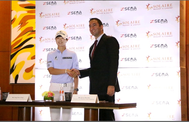 PHOTO: Two-time Major champion Park Sung Hyun signs a two-year sponsorship deal with executive vice president for Casino Marketing, Solaire Resort and Casino, Cyrus Sherefat at the Solaire Resort and Casino.
